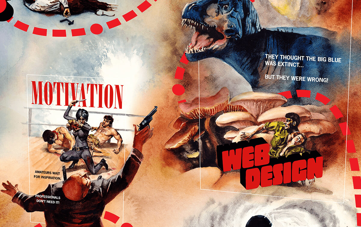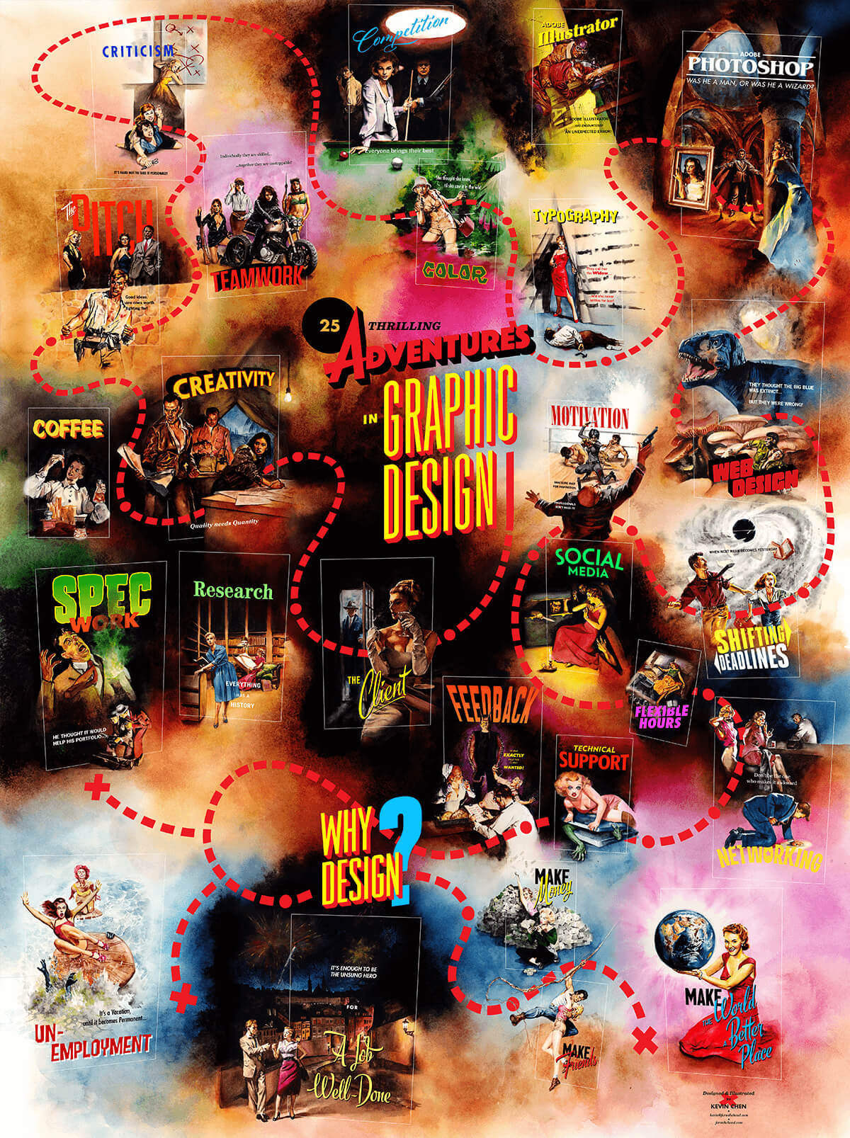 Adventures in Graphic Design was a personal project to create a piece of self-promotional material, meant to assist me in transitioning back to full-time design work after several years of freelancing. Adopting the aesthetic of early 20th-century pulp covers, 25 watercolor paintings were illustrated and then composited to create a tableau describing both the triumphs and challenges of being a graphic designer.