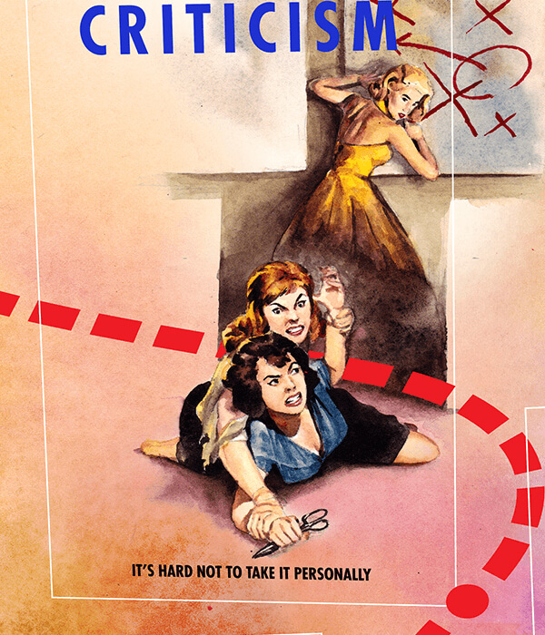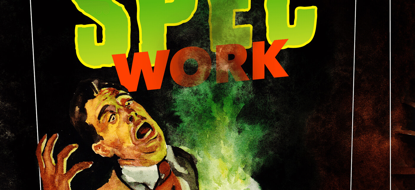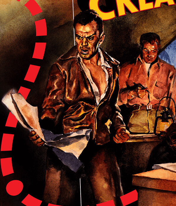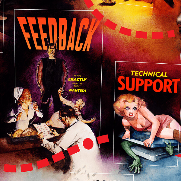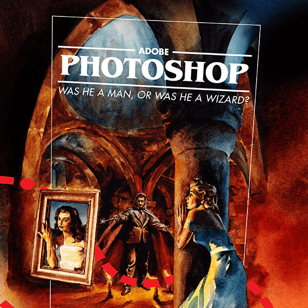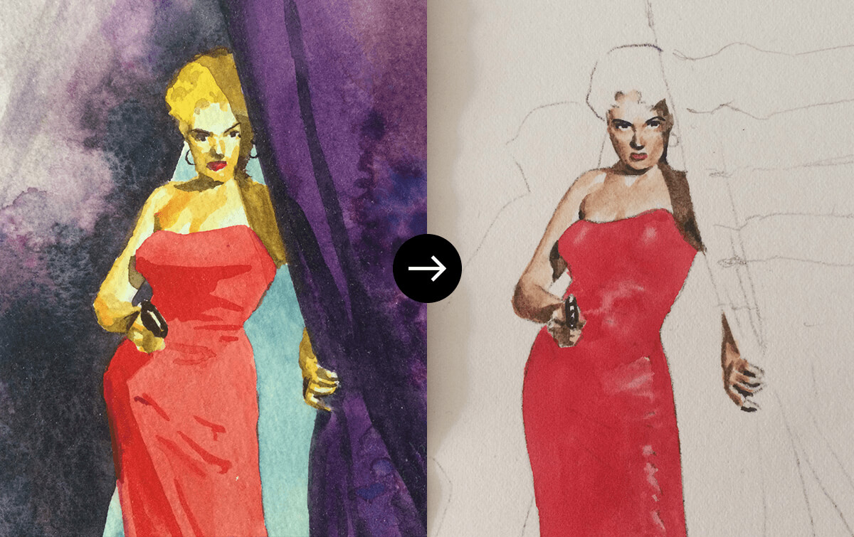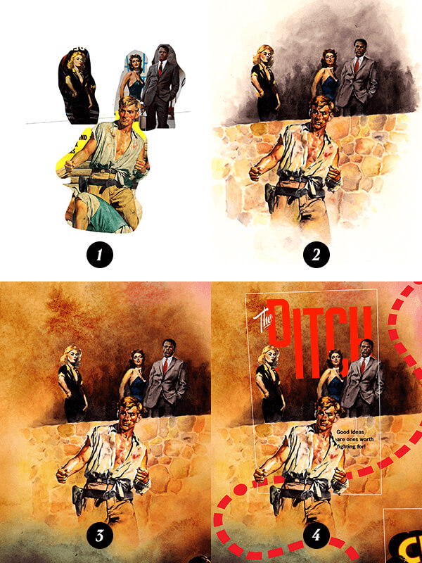 A composition was first created using pieces from pulp art or photographic references. That composition was then re-painted as a watercolor painting for consistency, combined with a watercolor backdrop, with graphics applied as the final step.