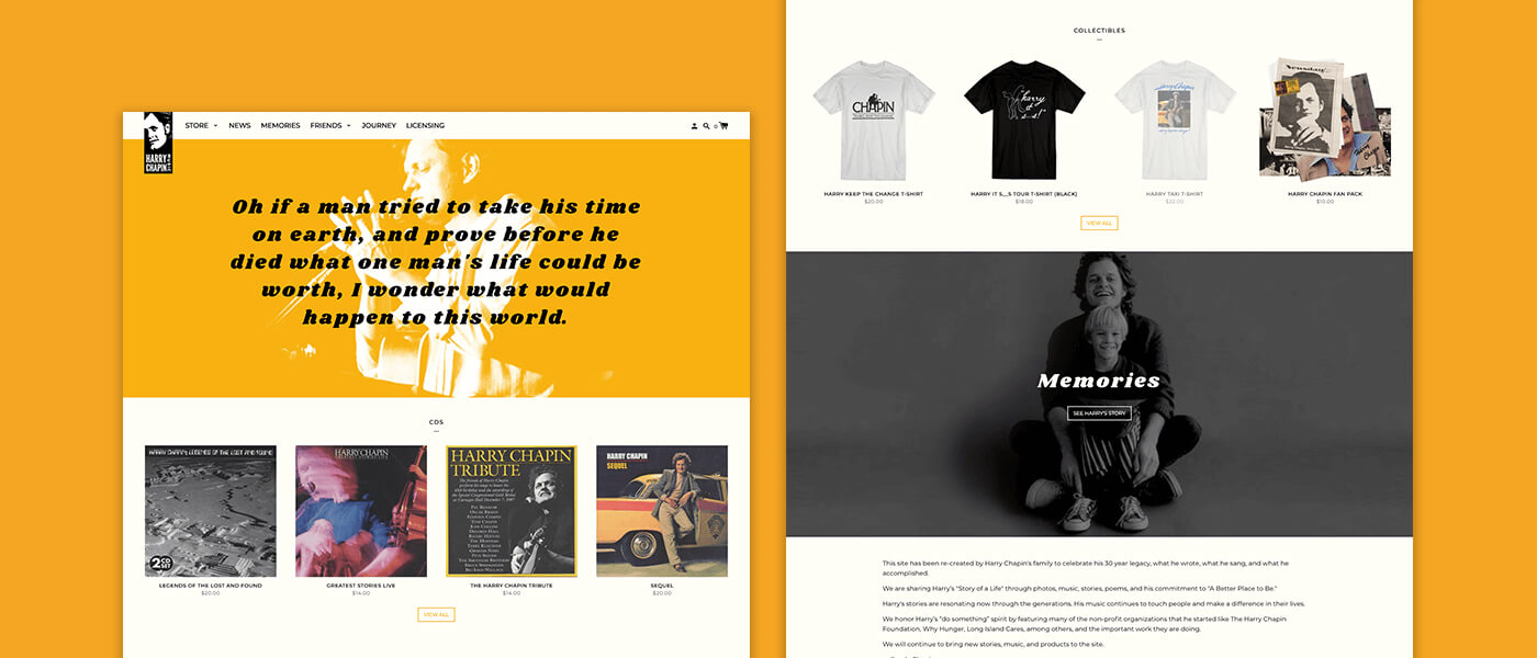Harry Chapin’s existing site served as a hub for Harry’s family photos and a functional store for his merchandise, and while very bare bones it did become a vital destination for his online fan community. We helped them transition to a Shopify site to facilitate a better store experience, but also built out a new gallery system along with an interactive timeline to elevate its function as a memorial to his life and work.