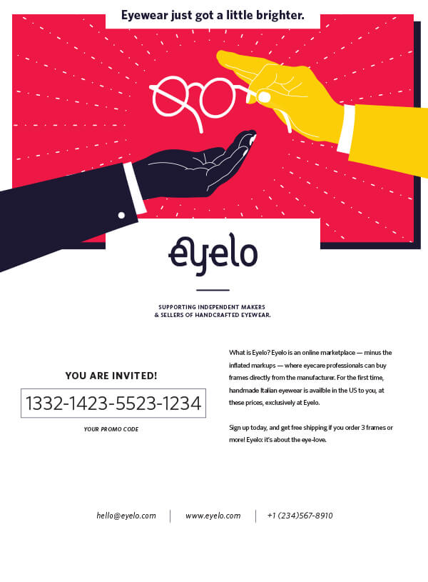 Eyelo is an amalgamation of “Eye Love”, expressing the love of quality eyewear shared by the craftsmen who make them, and the professionals who prepare them for customers. The brand’s colorful palette and whimsical photography act as a contrast to the blandness of B2B experiences, and issue a direct challenge to the joyless corporate entities dominating the industry.