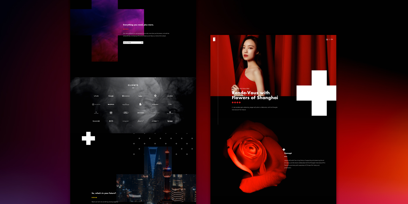 To better serve their growing cadre of international clients, Future+ looked to break the trend of overly-embellished and excessively wordy websites typically favored by other Chinese agencies. With this in mind, I opted for a clean layout, punctuating the design with bold shapes and subdued motion graphics.